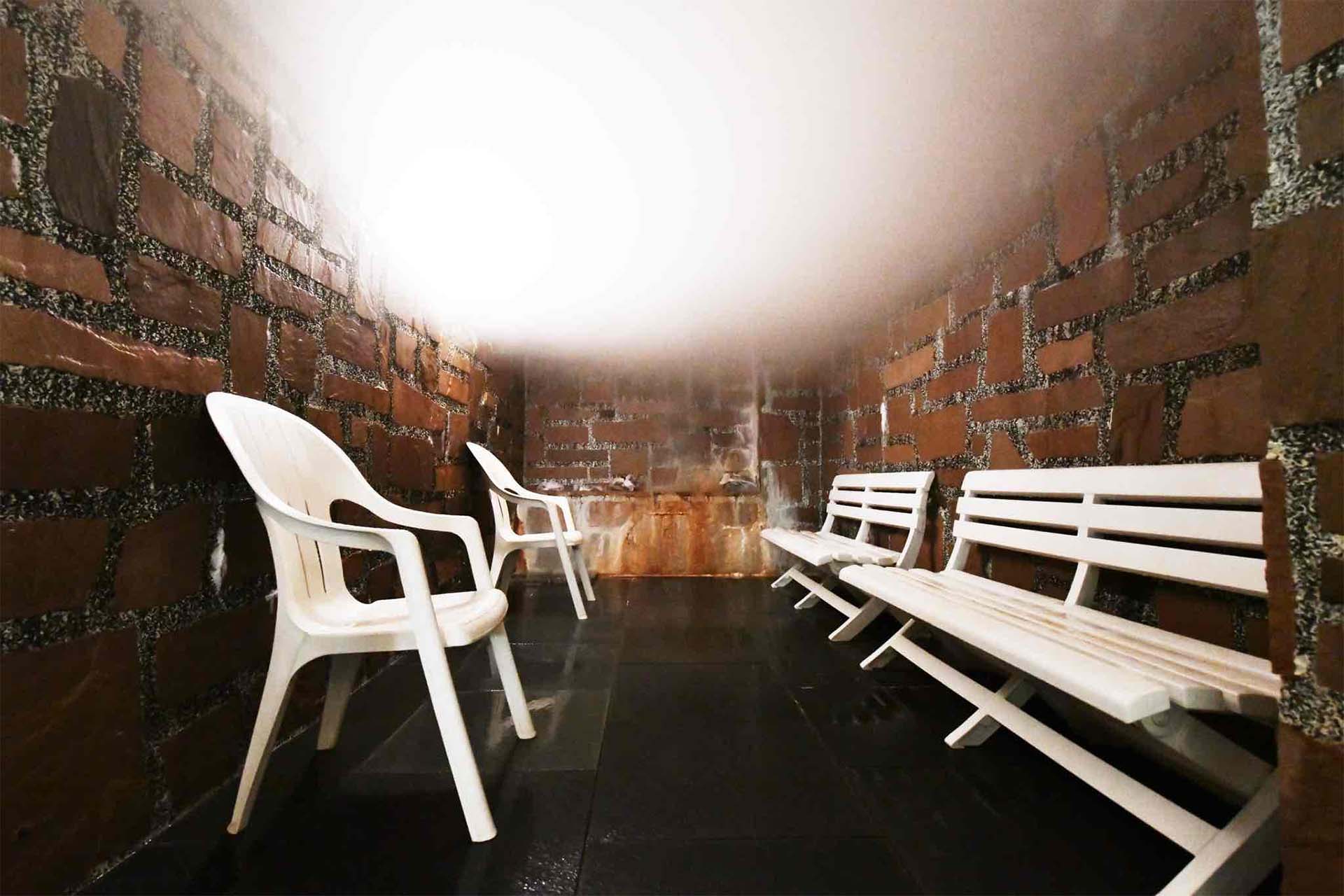 ヴィヒタ香るスチームサウナは大体50℃。目の前が見えない程のモクモク感で関東トップクラスの名物。